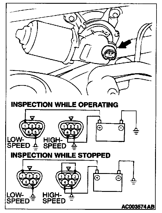 Connect a battery to the wiper motor as shown in the illustration, and check motor operation at low-speed and high- speed.