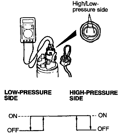 3. When the high/low-pressure sides of the dual pressure switch are at operation pressure (ON) and there is continuity between the respective terminals, then the condition is normal. It there is no continuity, replace the switch.