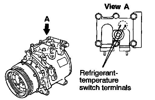 When the A/C is off, check that there is continuity between the refrigerant-temperature switch terminals. If no, replace the compressor assembly.