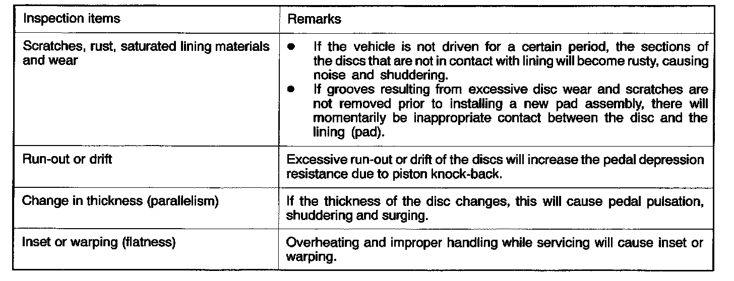 Before re-finishing or re-processing the brake disc surface, the following conditions should be checked.