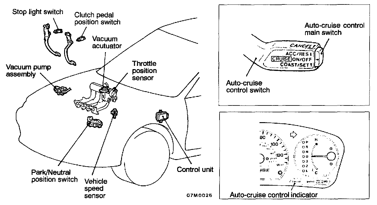 GENERAL INFORMATIONBy using the auto-cruise control, the driver can select and maintain a desired cruising speed [approximately 40 kph (25 mph) or more] without depressing the accelerator pedal.