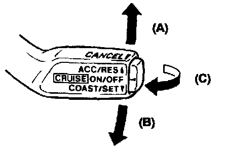 3. After pushing the auto-cruise control switch in the direction of arrow (B) in the illustration, press the cruise control main switch to the ON position, and within 1 second after doing this, push the cruise control switch back in the direction of arrow (A).