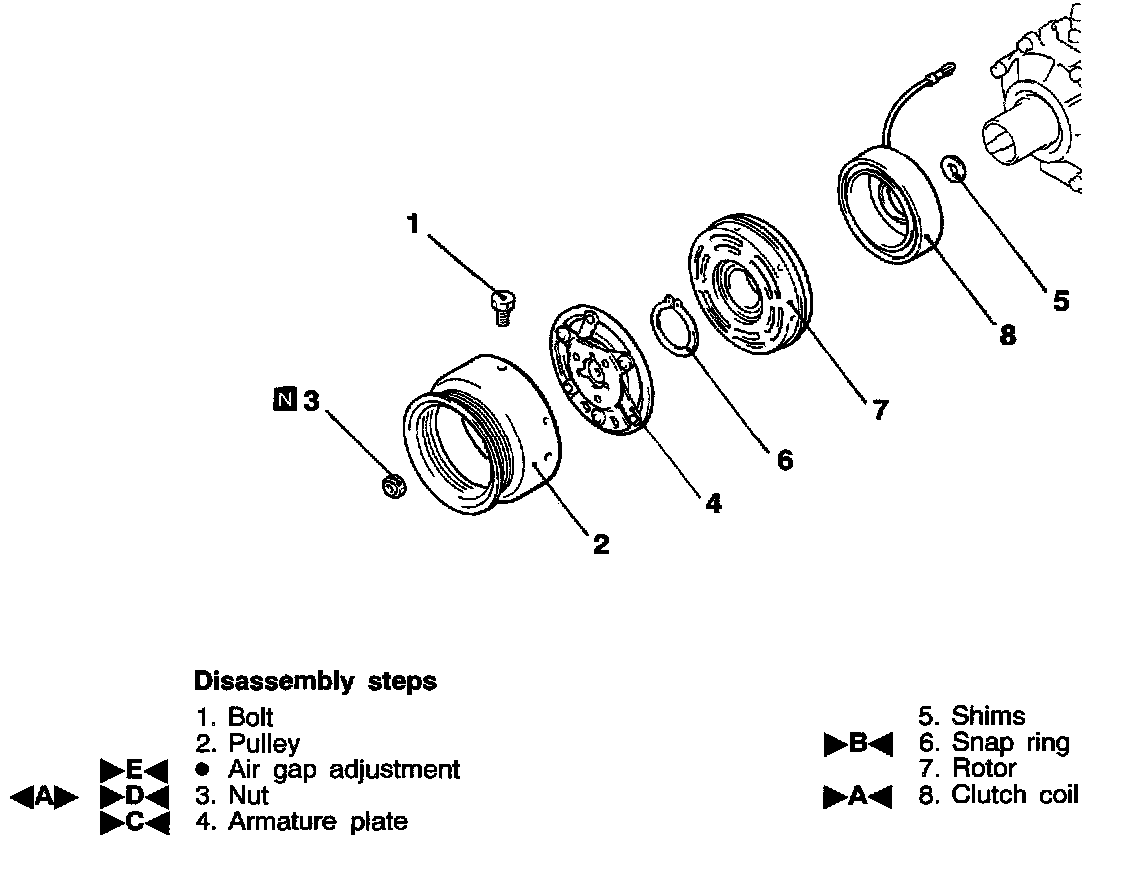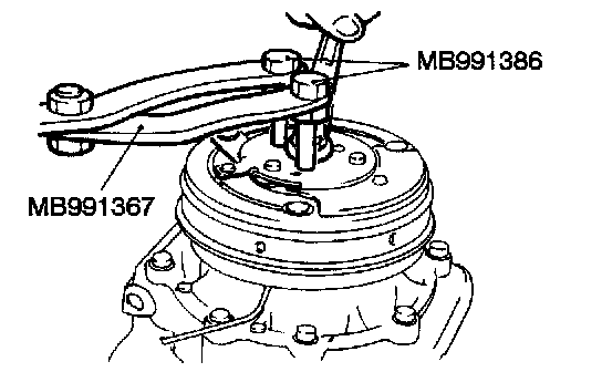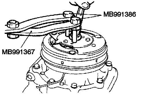 Use the special tool to hold the magnet clutch, and tighten the nut in the same manner as removal.