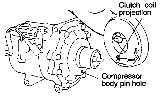 When installing the clutch coil to the A/C compressor body, install so that the pin hole of the A/C compressor body and the clutch coil projection are aligned.