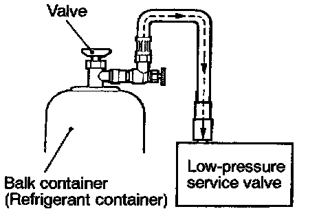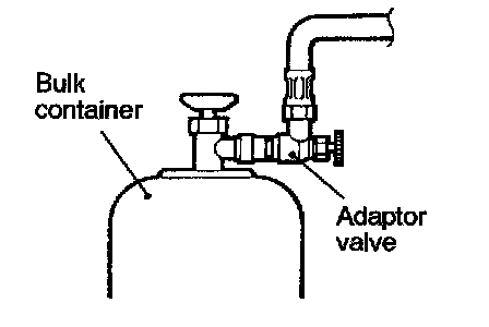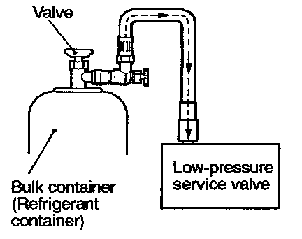 CAUTION: If the bulk container is inverted, liquid refrigerant may be draw into the compressor damaging it by hydraulic lock. Keep the bulk container upright to ensure that refrigerant is changed in gas state.
