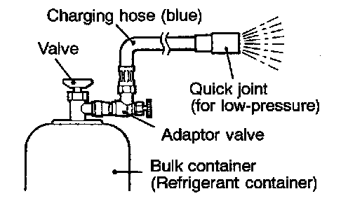 CAUTION: If the bulk container can is inverted, liquid refrigerant may be drawn into the compressor damaging it by hydraulic lock. Keep the bulk container upright to ensure that refrigerant is charged in gas state.