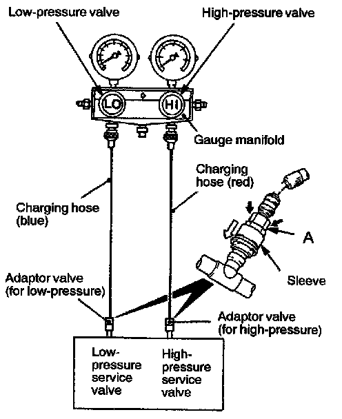 NOTE: The high-pressure service valve is on discharge pipe B, and the low-pressure service valve is on the suction hose.