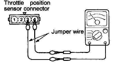 2. Connect an ohmmeter between terminal 3 (closed throttle position switch) and 4 (sensor ground) by using jumper wires.