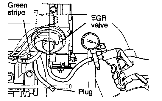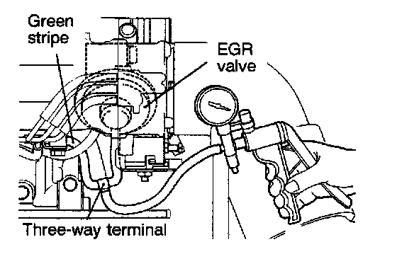 EGR SYSTEM CHECK1. Disconnect the vacuum hose (green stripe) from the EGR valve, and then connect a hand vacuum pump via the three-way terminal.
