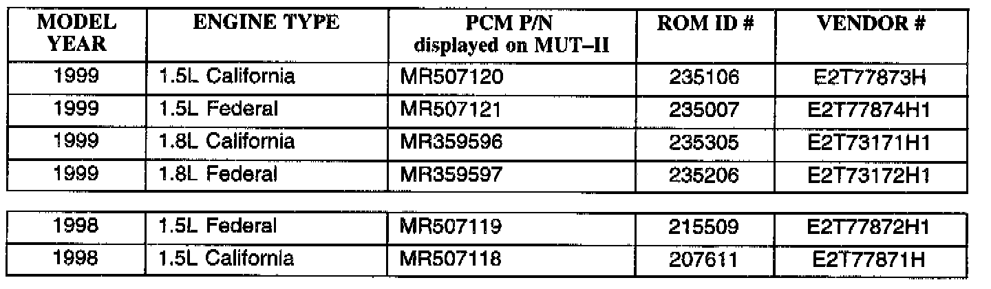 To verify that the correct reprogramming has been made, the ROM ID number will display on the MUT-II screen. The table below shows the vehicle models and their appropriate PCM part numbers ROM ID numbers that display after reprogramming. Also enter the appropriate vendor number listed below.