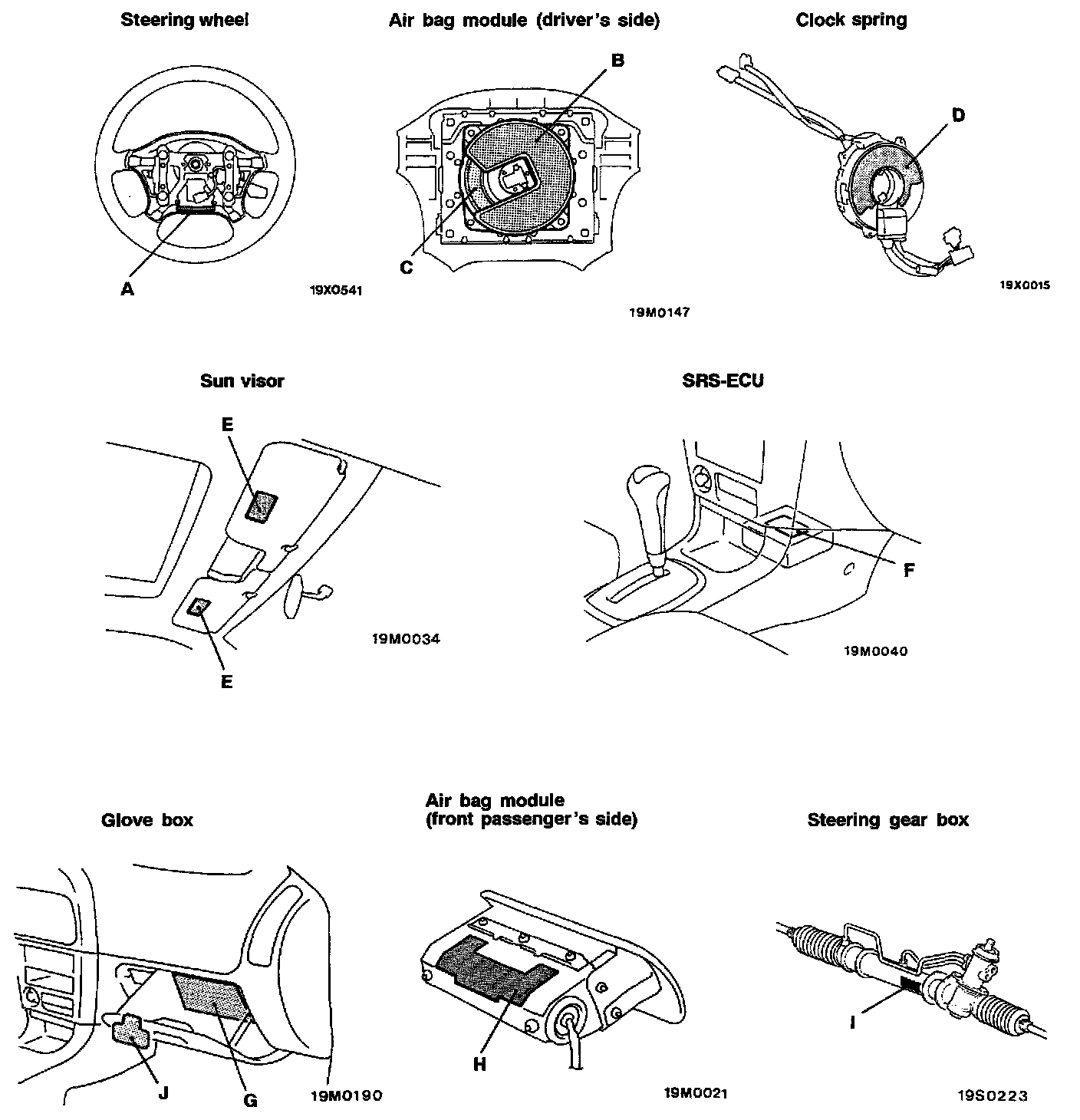 A number of caution labels related to the SRS are found in the vehicle, as shown in the illustrations.