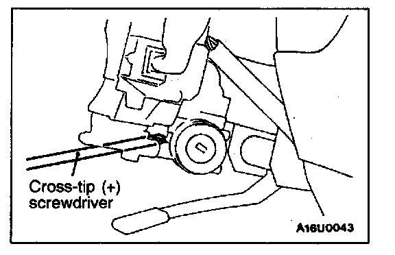 2. Using a cross-tip (+) screwdriver (small) or similar tool, push the lock pin of the steering lock cylinder inward and then pull the steering lock cylinder toward you.