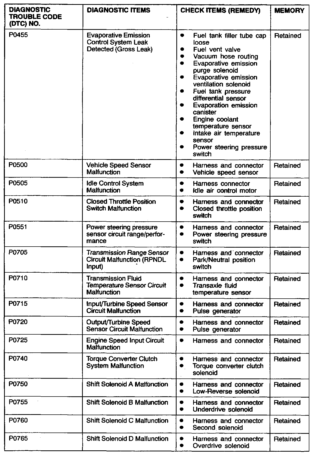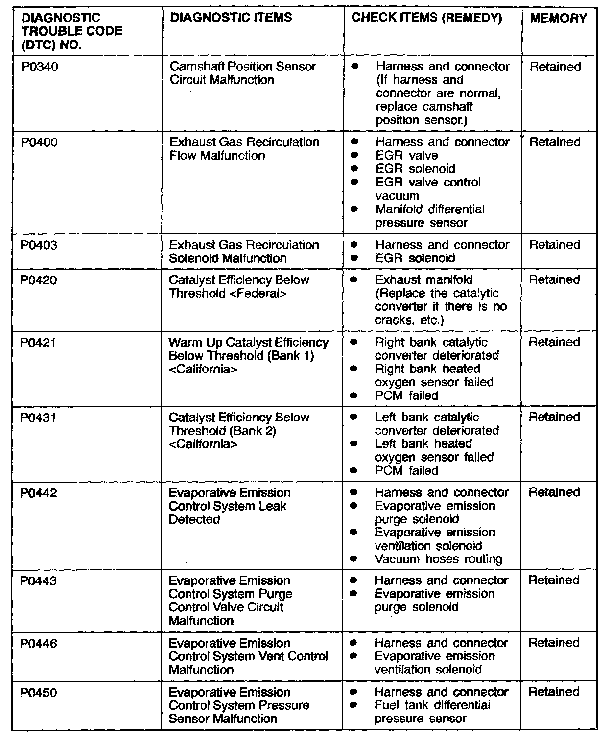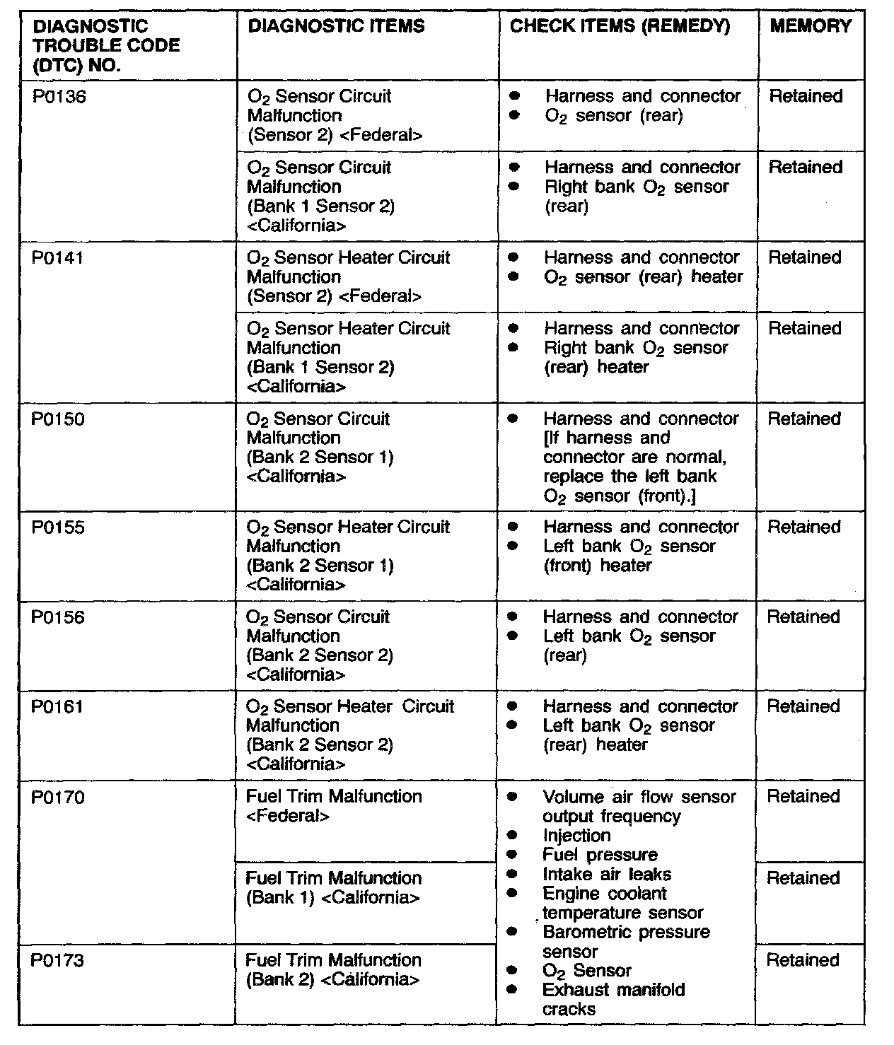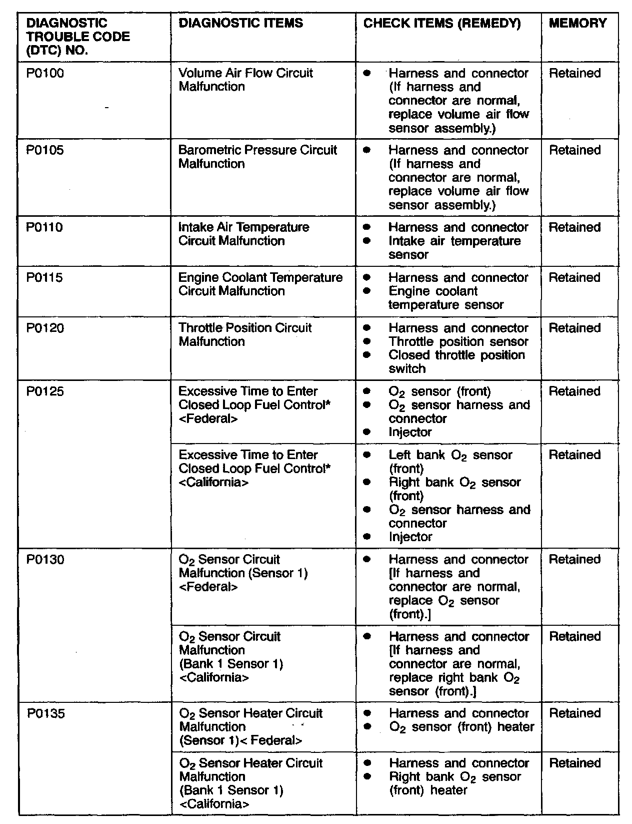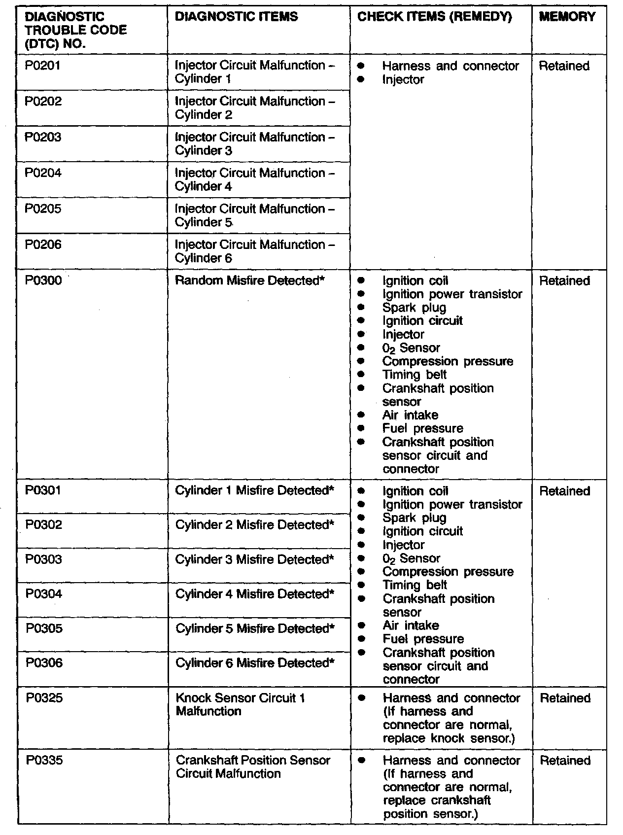 NOTE: After the PCM detects a malfunction, a diagnostic trouble code is recorded when the engine is next started and the same malfunction is re-detected. However for items marked with a "*" the diagnostic trouble code is recorded on the first detection of the malfunction.