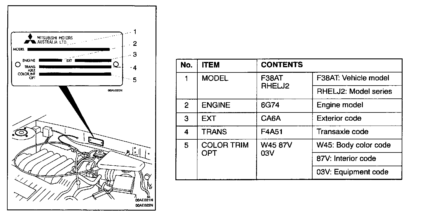 The plate shows model code, engine model, transaxle model, and body color code.