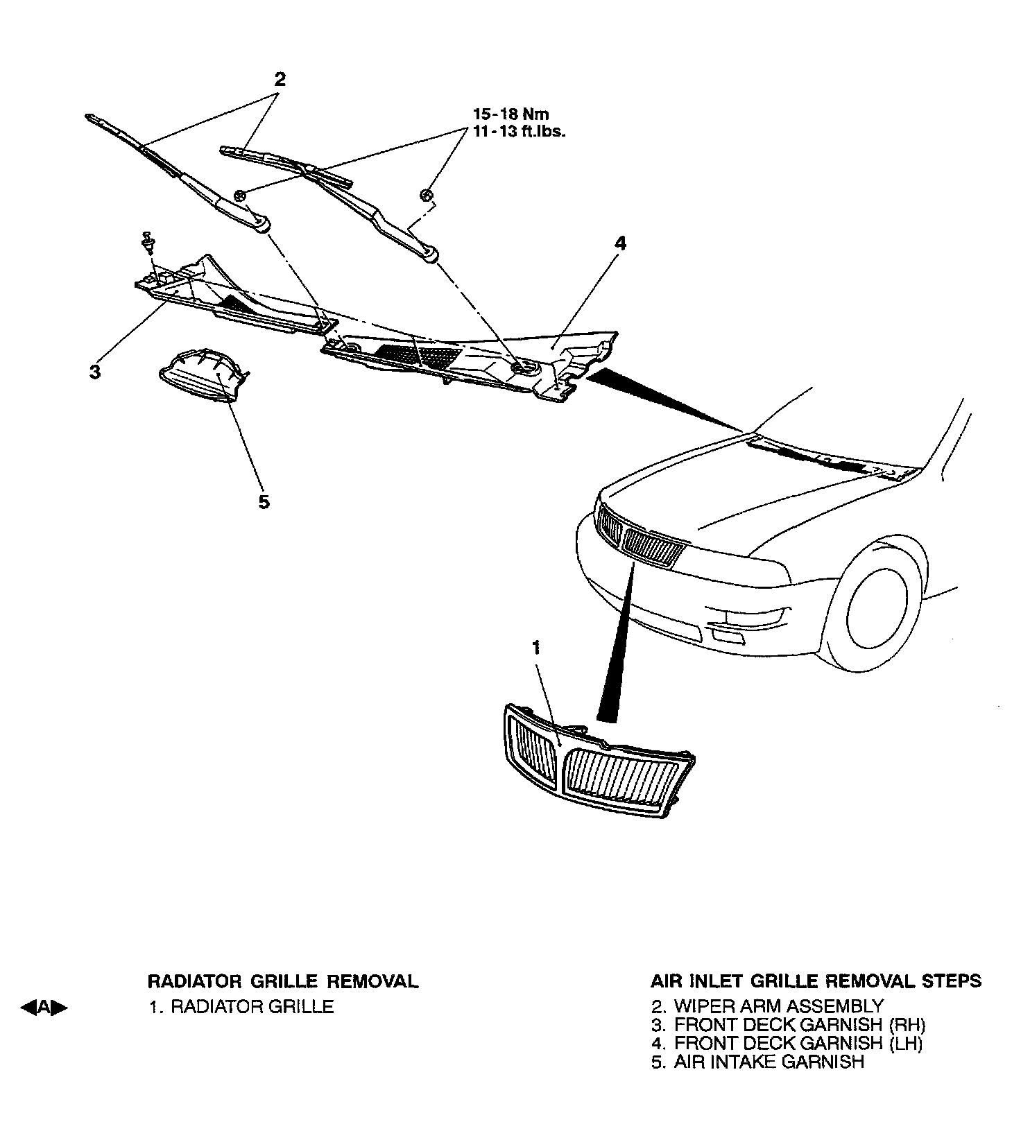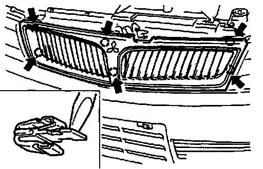 While gently pulling the radiator grille towards you, use a flat-bladed screwdriver to push the clip catches in the direction indicated by the arrows.