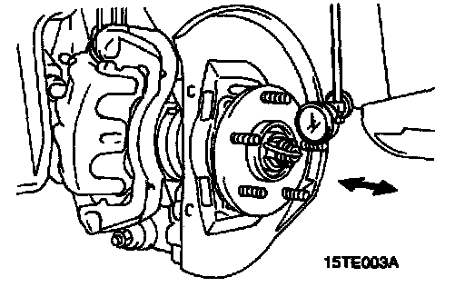 2. Remove the brake disc, and then place a dial gauge as shown in the illustration; then move the hub in the axial direction and measure the play.