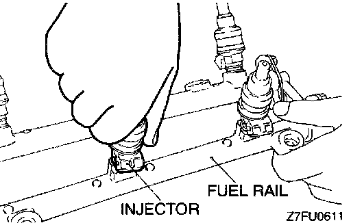 2. Insert the injector top end into the fuel rail. Be careful not to damage O-ring during installation.