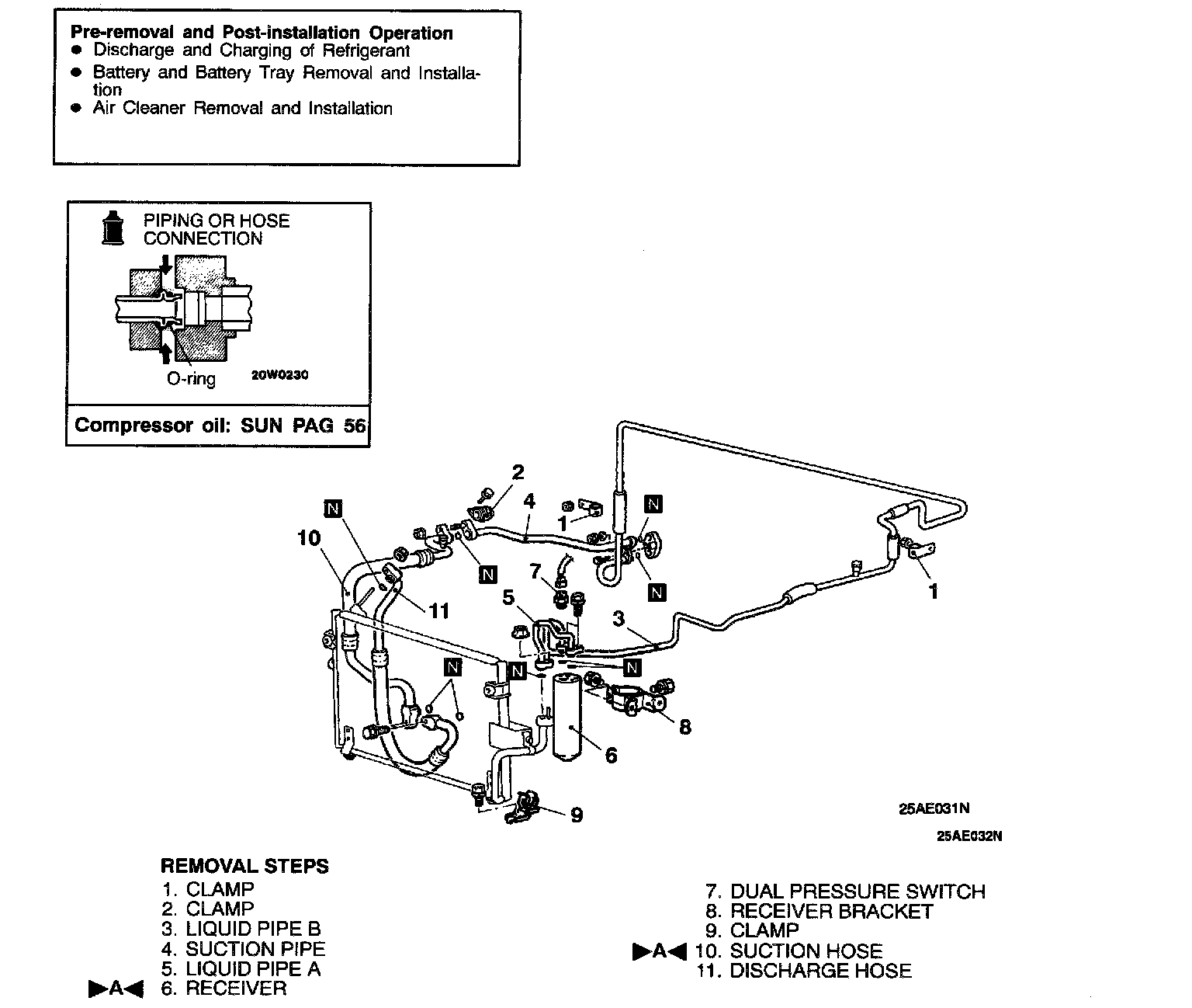 When replacing the suction hose, or the receiver assembly with new ones, refill them with a specified amount of compressor oil, and then install each of them.