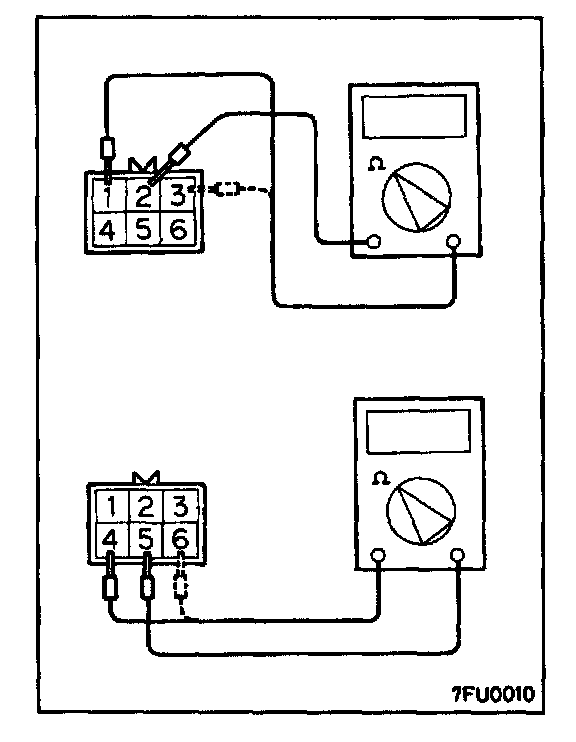 3. Measure the resistance between terminal 5 (green clip of the special tool) and either terminal 6 (yellow clip) or terminal 4 (black clip) of the connector at the idle control motor side.