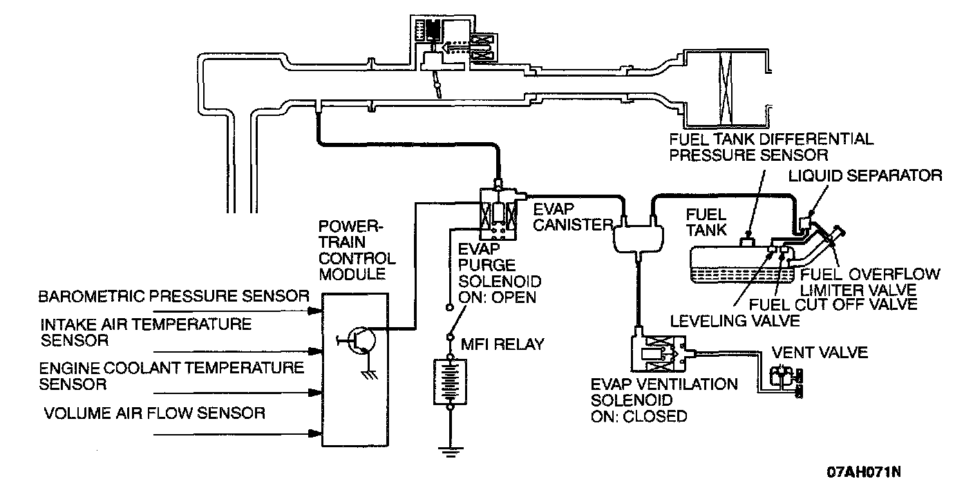 The evaporative emission control system prevents fuel vapors generated in the fuel tank from escaping into the atmosphere.Fuel vapors from the fuel tank flow through the fuel tank pressure control valve and vapor pipe/hose to be stored temporarily in the EVAP canister.