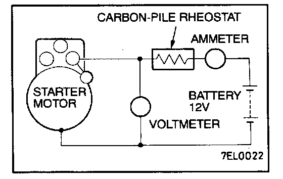 2. Connect a test ammeter (130 - ampere scale) and carbon pile rheostat in series between battery positive post and starter motor terminal.