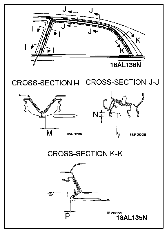 4. Measure the distance between the rear edge of the glass and the "C" pillar moulding at cross section K-K. This will give dimension "P".