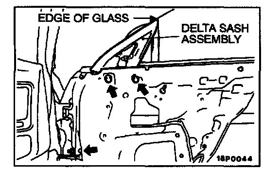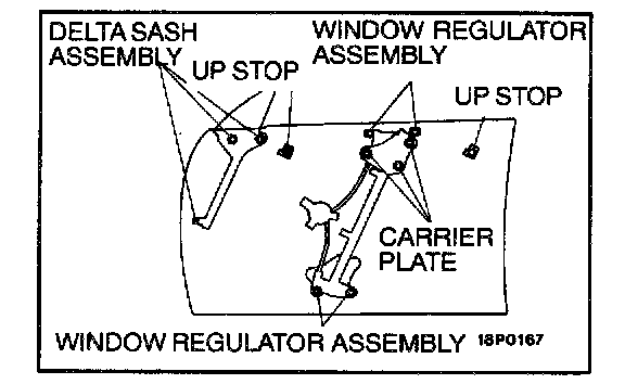 5. Loosen the mounting bolts and nuts for up stops, delta sash, carrier plate, and regulator (bottom).