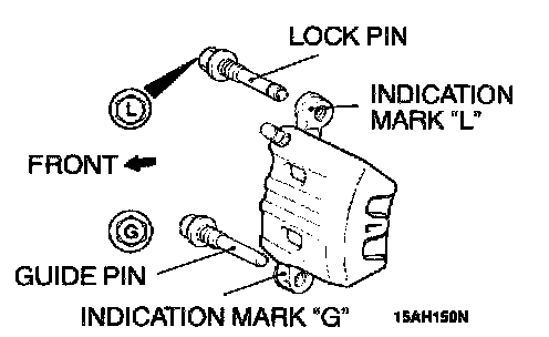 Install the guide pin and lock pin as illustrated so that each head mark of the guide pin and the lock pin matches the indication mark located on the caliper body.