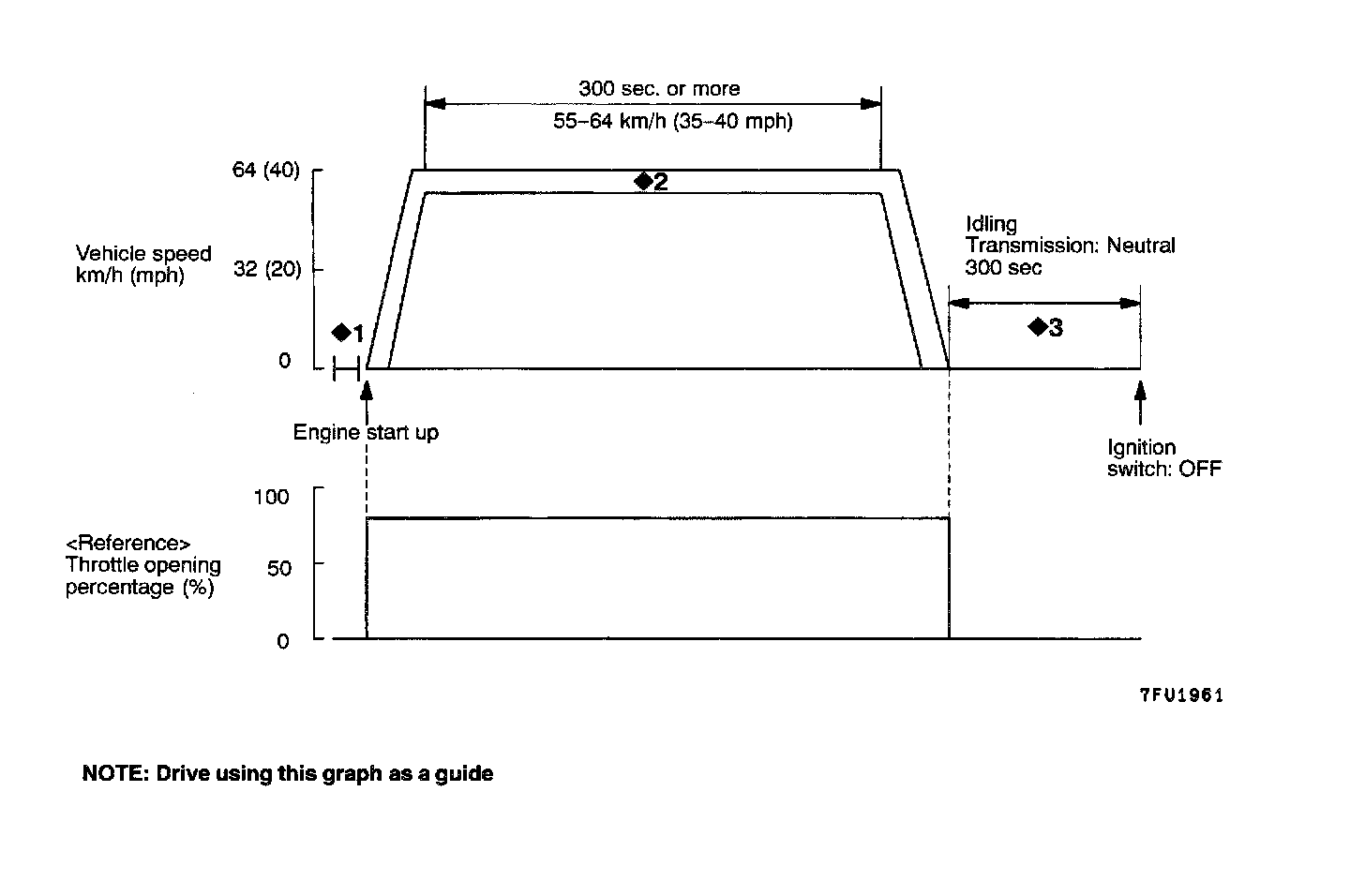 <>2: Start the engine and accelerate quickly until speed reaches 56 - 64 km/h (35 - 40 mph) After driving for 300 seconds or more, stop the vehicle. Braking or operating the throttle is permissible during this period.