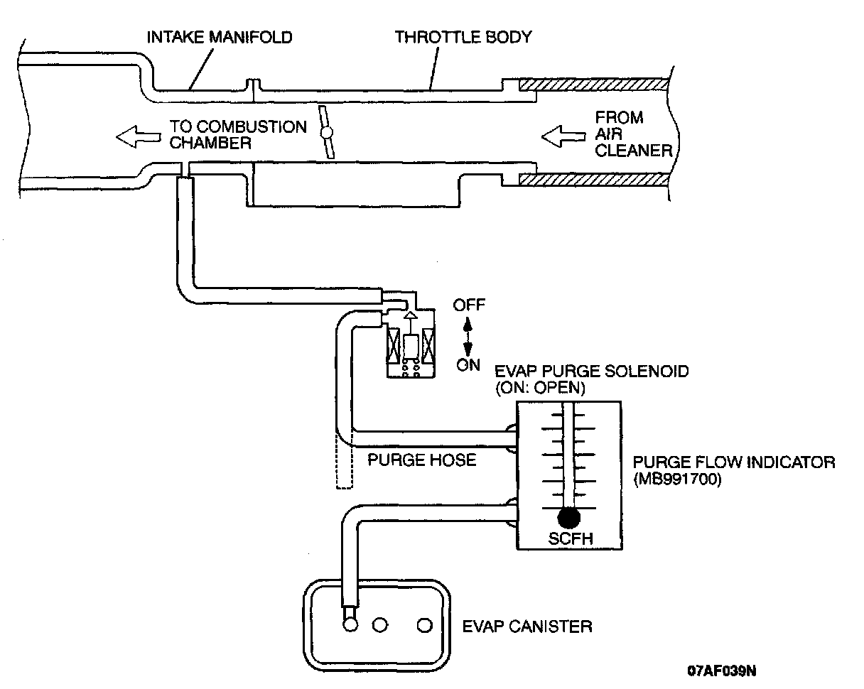 1. Disconnect the purge hose from the evaporative emission (EVAP) canister, and connect the special tool MB991700 between the EVAP canister and the purge hose.