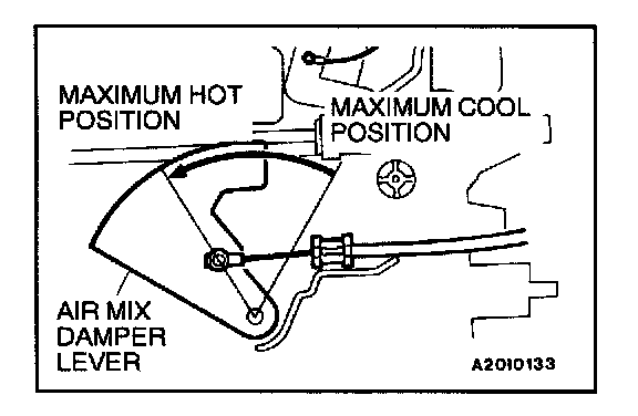 2. Set the air mix damper lever of the heater/cooler unit to the maximum hot position as shown in the illustration, and then connect the cable to the lever pin.