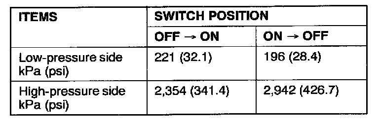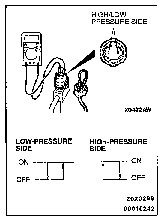 3. When the high/low pressure sides of the dual pressure switch are at operation pressure (ON) and there is continuity between the respective terminals, then the condition is normal. If there is no continuity, replace the switch.