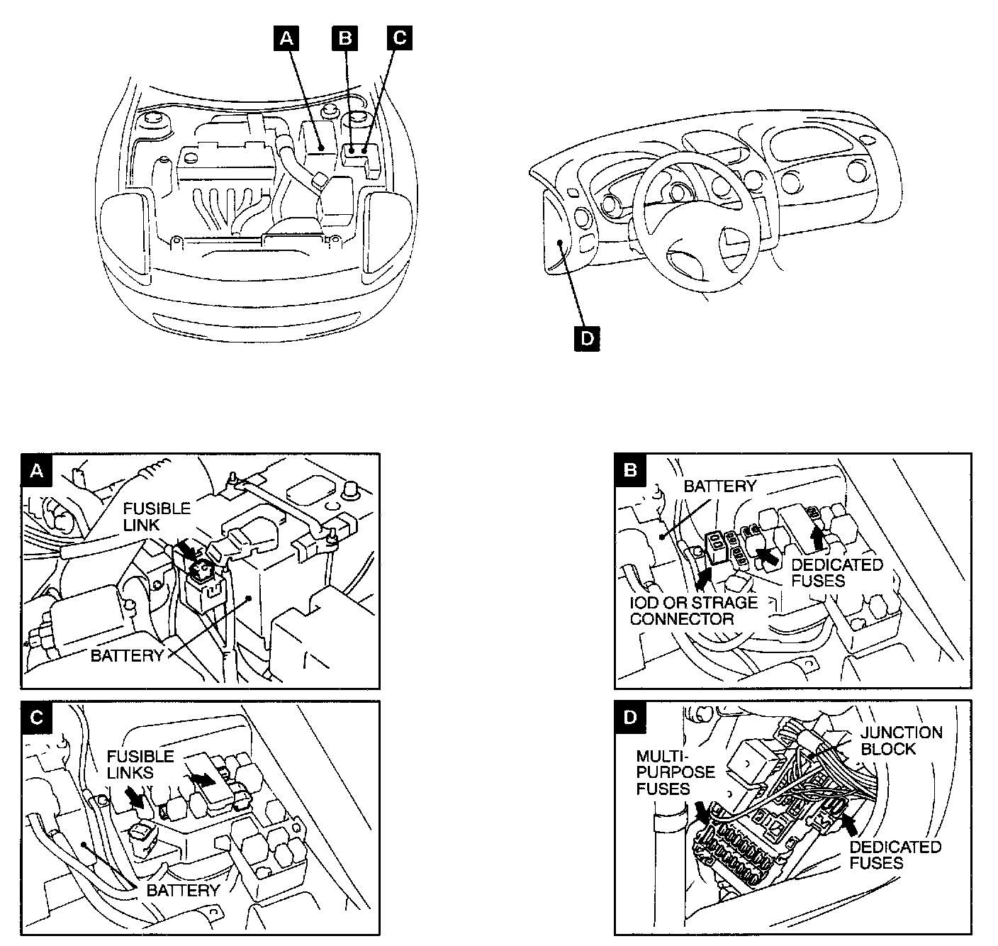 Fusible Link, Fuse And Iod Or Storage Connector Location Overall View And Views A-D: