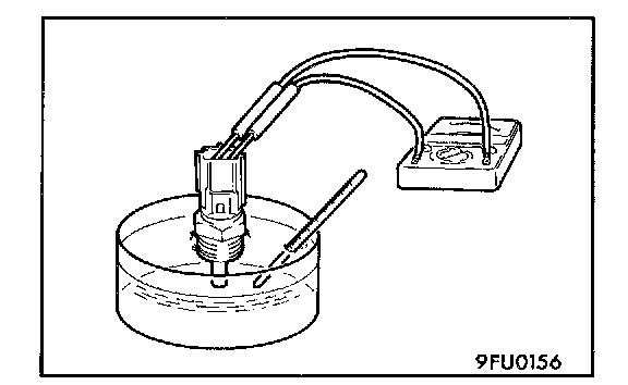 2. With the temperature sensing portion of engine coolant temperature sensor immersed in hot water, check the resistance.
