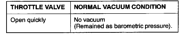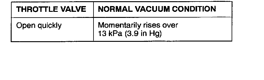 2. Start the engine. Check the vacuum condition when the throttle valve is opened suddenly (rewing) during cold and hot engine conditions. If the engine is hot and the vacuum does not rise over 13 kPa (3.9 in.Hg), perform the vacuum control valve check and EGR port vacuum check. Then continue to Step 3. If vacuum rises momentarily, proceed to Step 3.