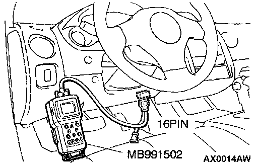 CAUTION: To prevent damage to scan tool MB991502, always turn the ignition switch to "LOCK" (OFF) position before connecting or disconnecting scan tool MB991502.