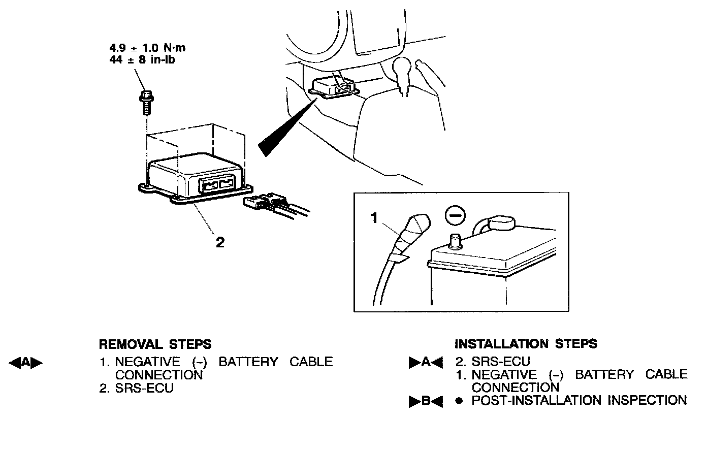 WARNING:1. Never attempt to disassemble or repair the SRS-ECU. If faulty, replace it.