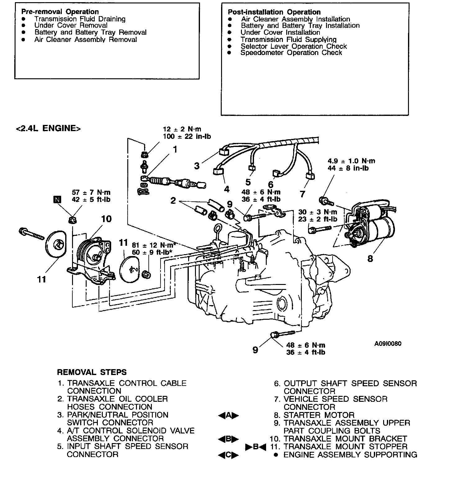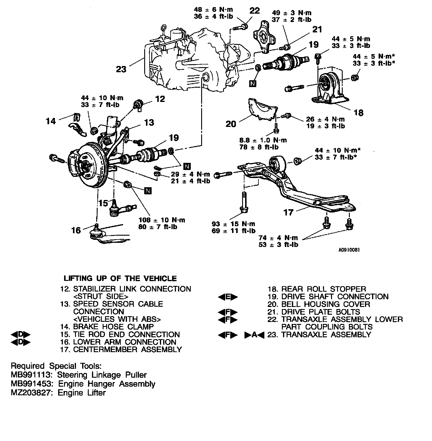 TRANSAXLE ASSEMBLY REPLACEMENT W/ RELATED COMPONENTSCAUTION: *:Indicates parts which should be temporarily tightened, and then fully tightened after placing the vehicle horizontally and loading the full weight of the engine on the vehicle body.