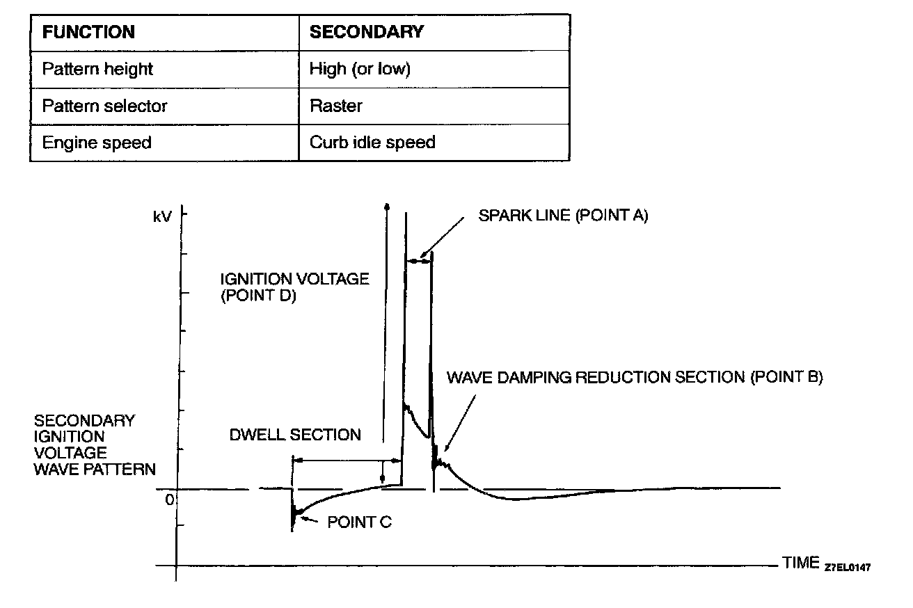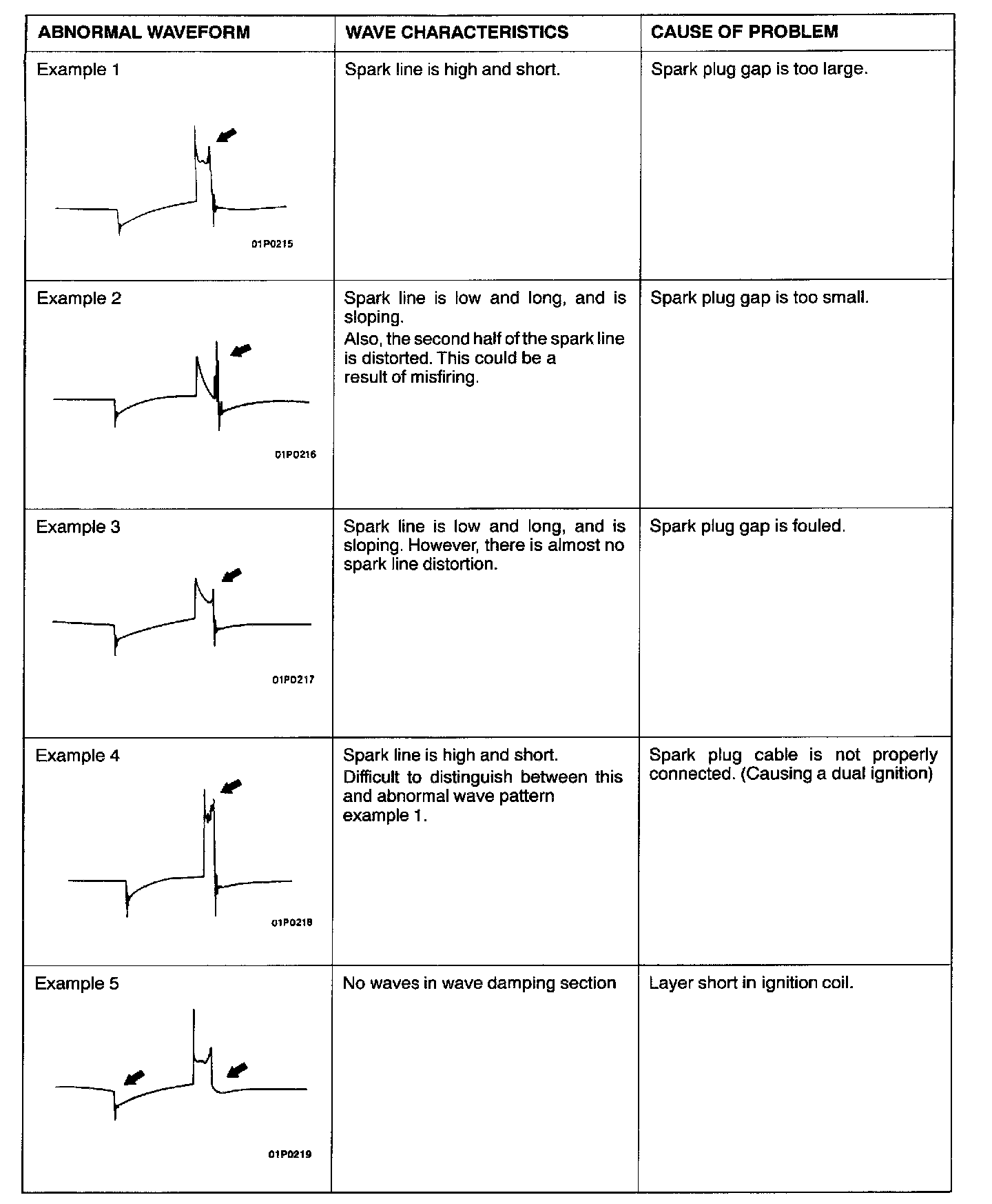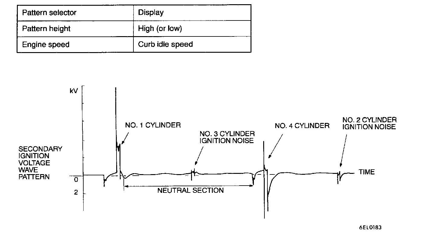 NOTE: Because of the two-cylinder simultaneous ignition system, the waves for two cylinders in each group appear during wave observation. However, wave observation is carried out for the cylinder (Number 1 or 3) with the spark plug cable which has been clamped by the secondary pickup.