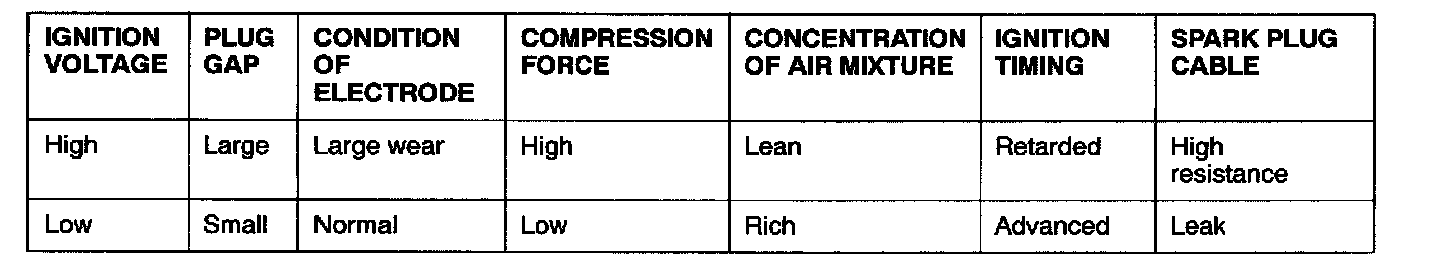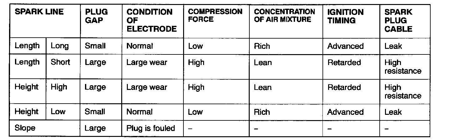 Point A: The height, length and slope of the spark line (refer to abnormal waveform examples 1, 2, 3 and 4) show the following trends.