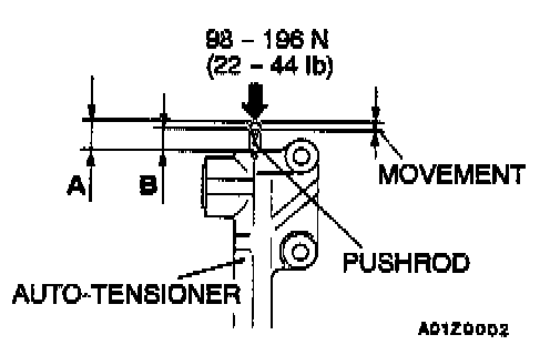 1. Apply 98 - 196 N (22 - 44 lbs.) force to the pushrod of the auto-tensioner by pressing it against a metal (cylinder block, etc.), and measure the movement of the pushrod.