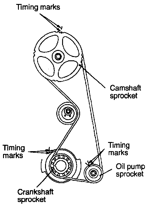 7. Check again to be sure that the timing marks of each sprocket are aligned.