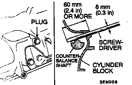 2. After aligning the timing mark on the oil pump sprocket, remove the cylinder block plug and insert a Phillips head screwdriver with a diameter of 8 mm (0.3 inch). Check to be sure that the screwdriver goes in 60 mm (2.4 inches) or more. If the screwdriver will only go in 20 - 25 mm (0.8 - 1.0 mm) before striking the counterbalance shaft, turn the sprocket once, realign the timing mark and check that the screwdriver goes in 60 mm (2.4 inches) or more. The screwdriver should not be taken out until the timing belt is installed.