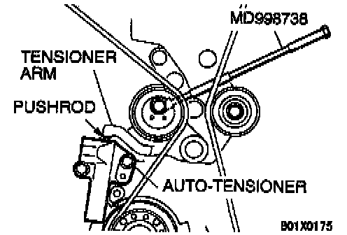 1. Remove the rubber plug from the rear of the timing belt cover assembly. Then screw in special tool MD998738 by hand until the tensioner arm is touching the auto-tensioner pushrod.