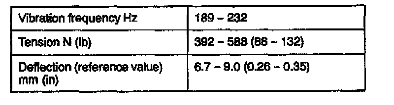 Apply 98 N (22 lbs.) of force to the middle (arrow) of the drive belt between the pulleys as shown, and check that the amount of deflection is within the standard value.