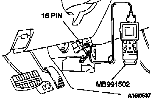 CAUTION: To prevent damage to scan tool MB991502, always turn the ignition switch to "LOCK" (OFF) position before connecting or disconnecting scan tool MB991502.