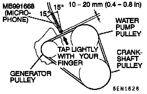 4. Hold the special tool MB991668 (microphone) to the middle of the drive belt between the pulleys (at the place indicated by the arrow), about 10 - 20 mm (0.4 - 0.8 inch) away from the rear surface of the belt and so that it is perpendicular to the belt (within an angle of ±15 degree angle).