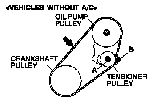 Apply 98 N (22 lbs.) of force to the middle of the drive belt between the pulleys (at the place indicated by the arrow) and check that the amount of deflection is within the standard value.