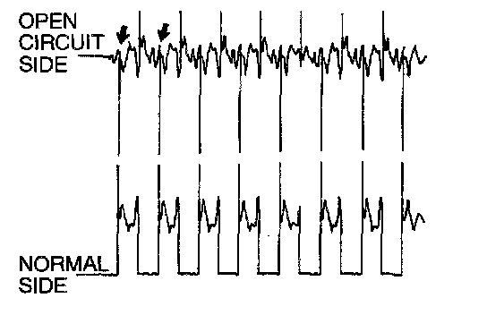 Current is not supplied to the motor coil on the open circuit side. (Voltage does not drop to 0 volt.) Furthermore, the induced electromotive force wave pattern at the normal side is slightly different from the normal wave pattern.