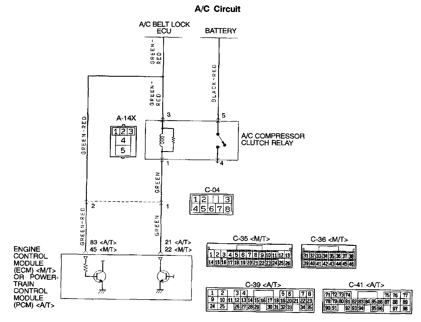 CIRCUIT OPERATION- When the A/C is "ON," the battery positive voltage is applied on the ECM (terminal 45)